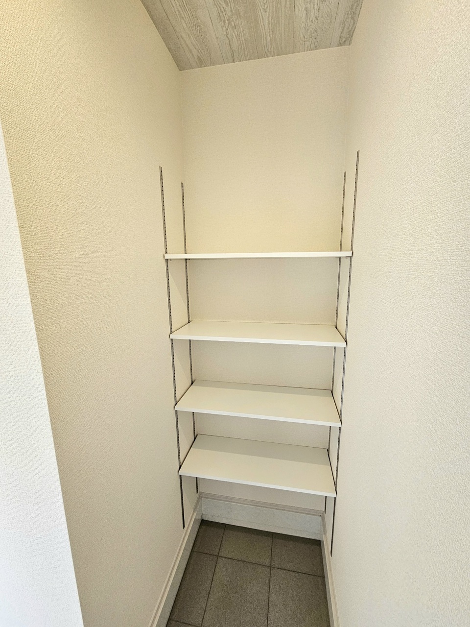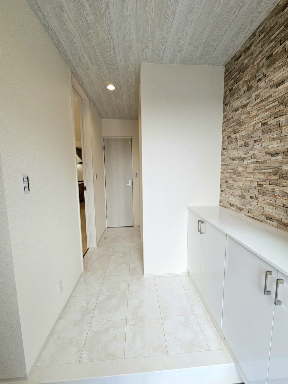 大理石調のフロアタイルとアクセントクロスを施した高級感溢れる玄関まわりです。