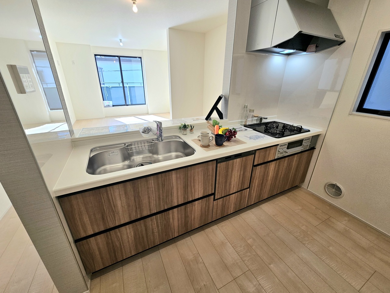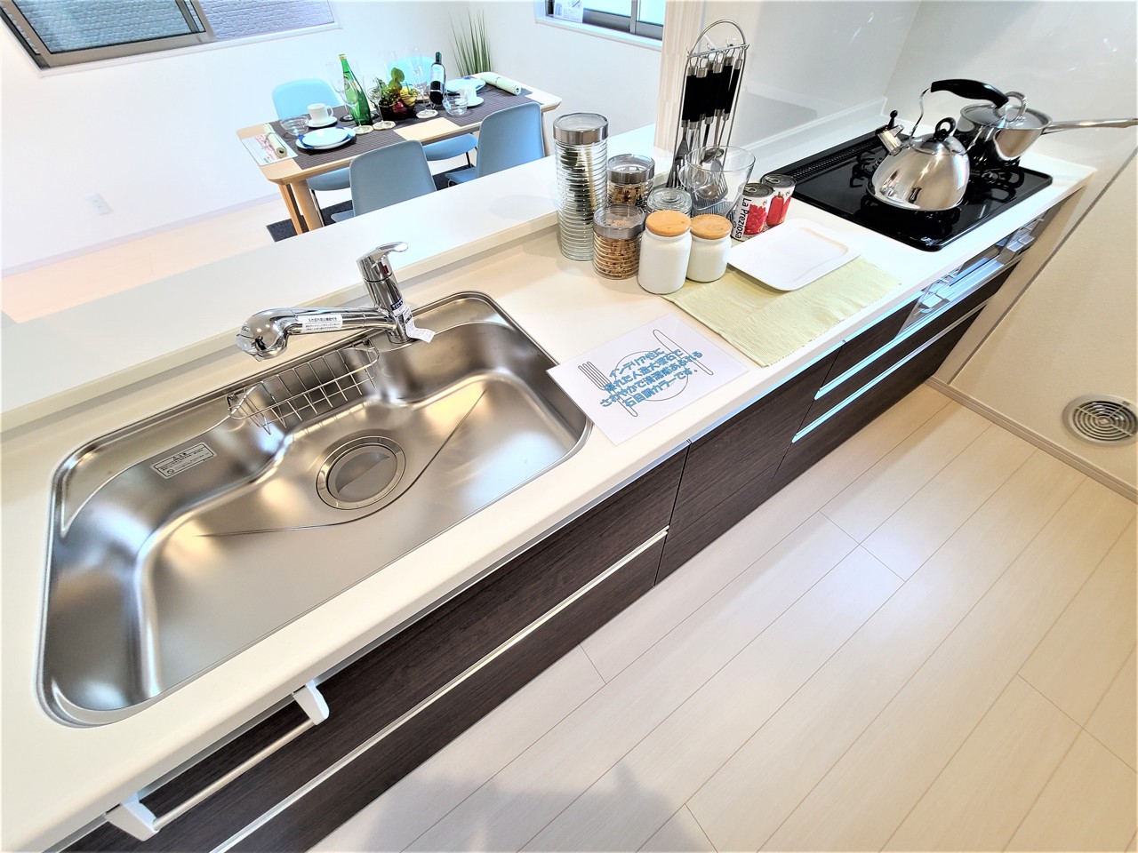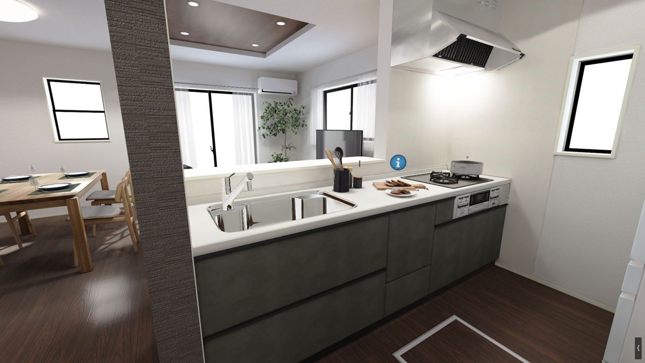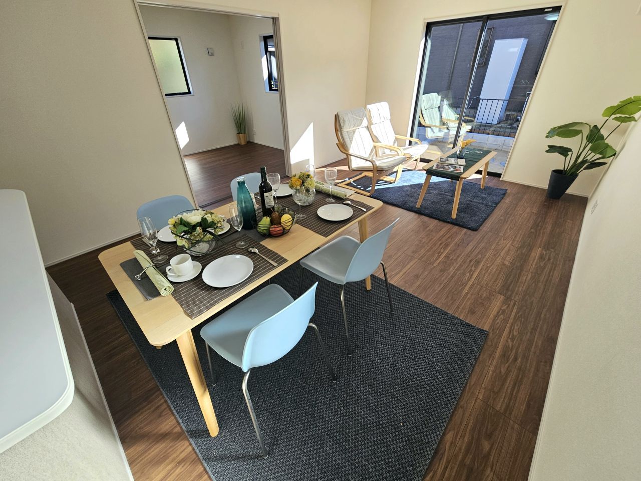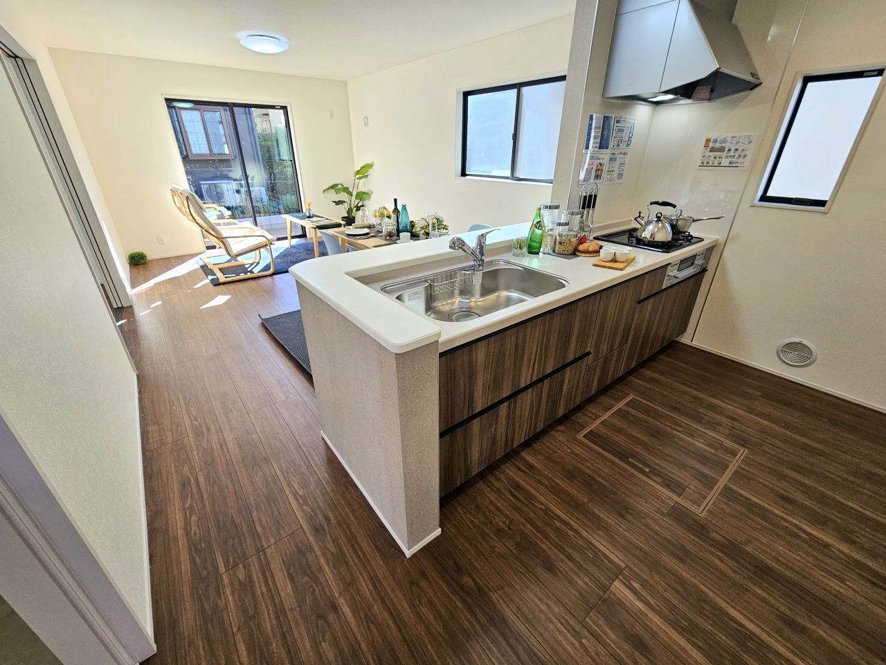 - 建物は安心の長期優良住宅、土地は広々35坪でカースペースは並列2台駐車可能です。8m道路に面した立地は開放感満点です。同仕様の完成物件をご覧いただいて内装や設備はイメージしていただけると思います。