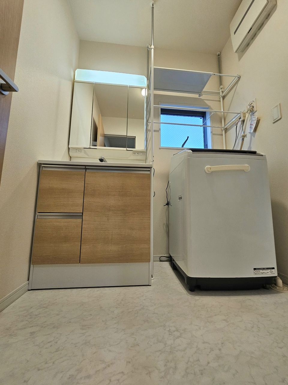 洗面化粧台は三面鏡タイプ。洗濯機を置いても十分余裕のある広さです。