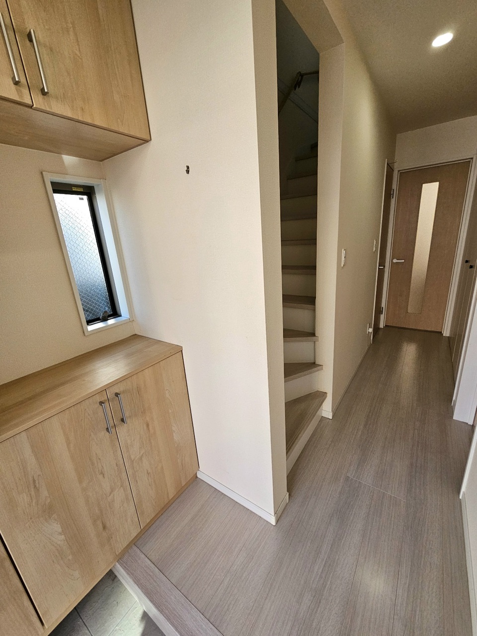 コの字型のシューズボックスは収納力十分。窓が付いていて明るく気持ちの良い玄関まわりとなっています。