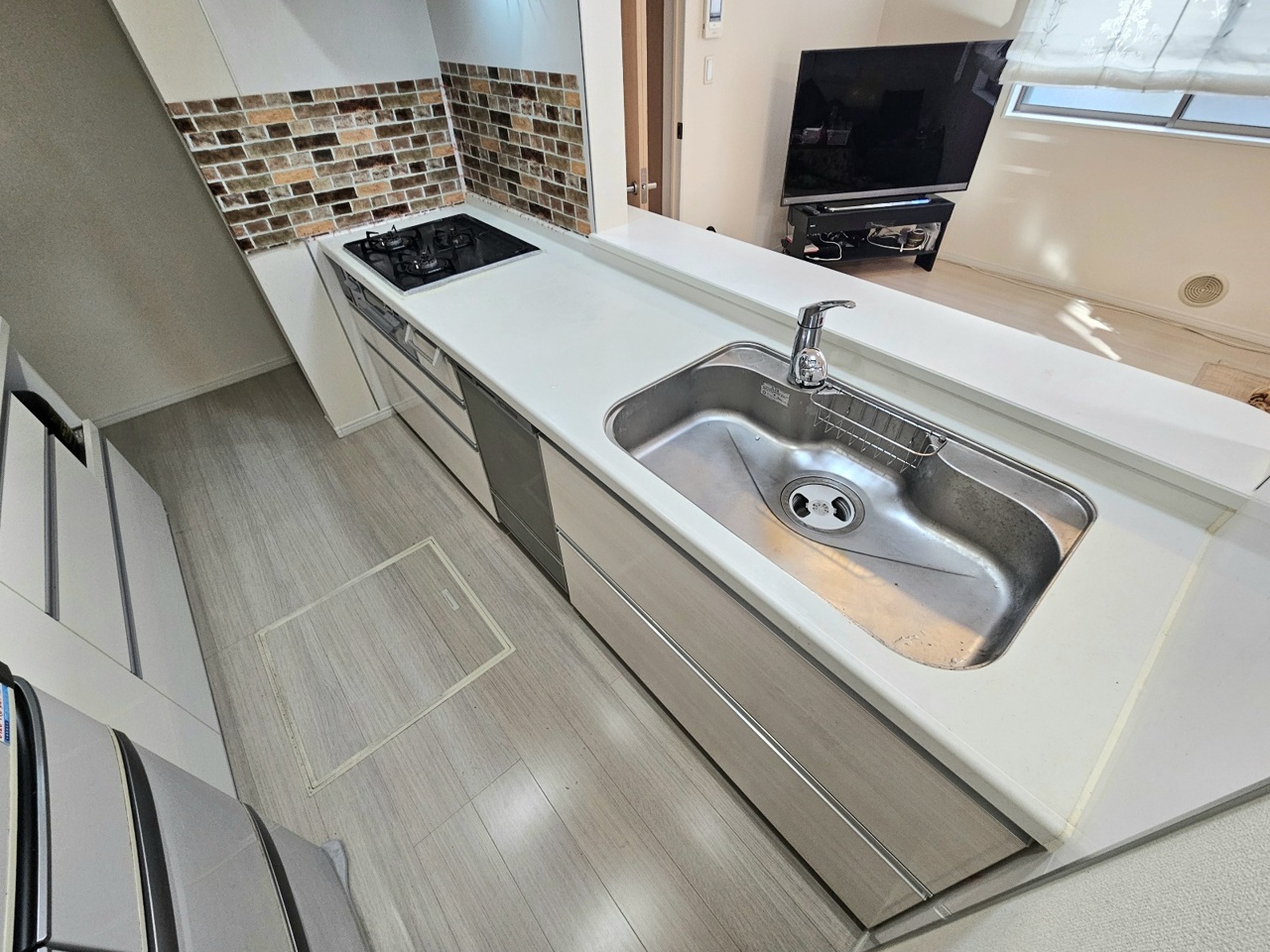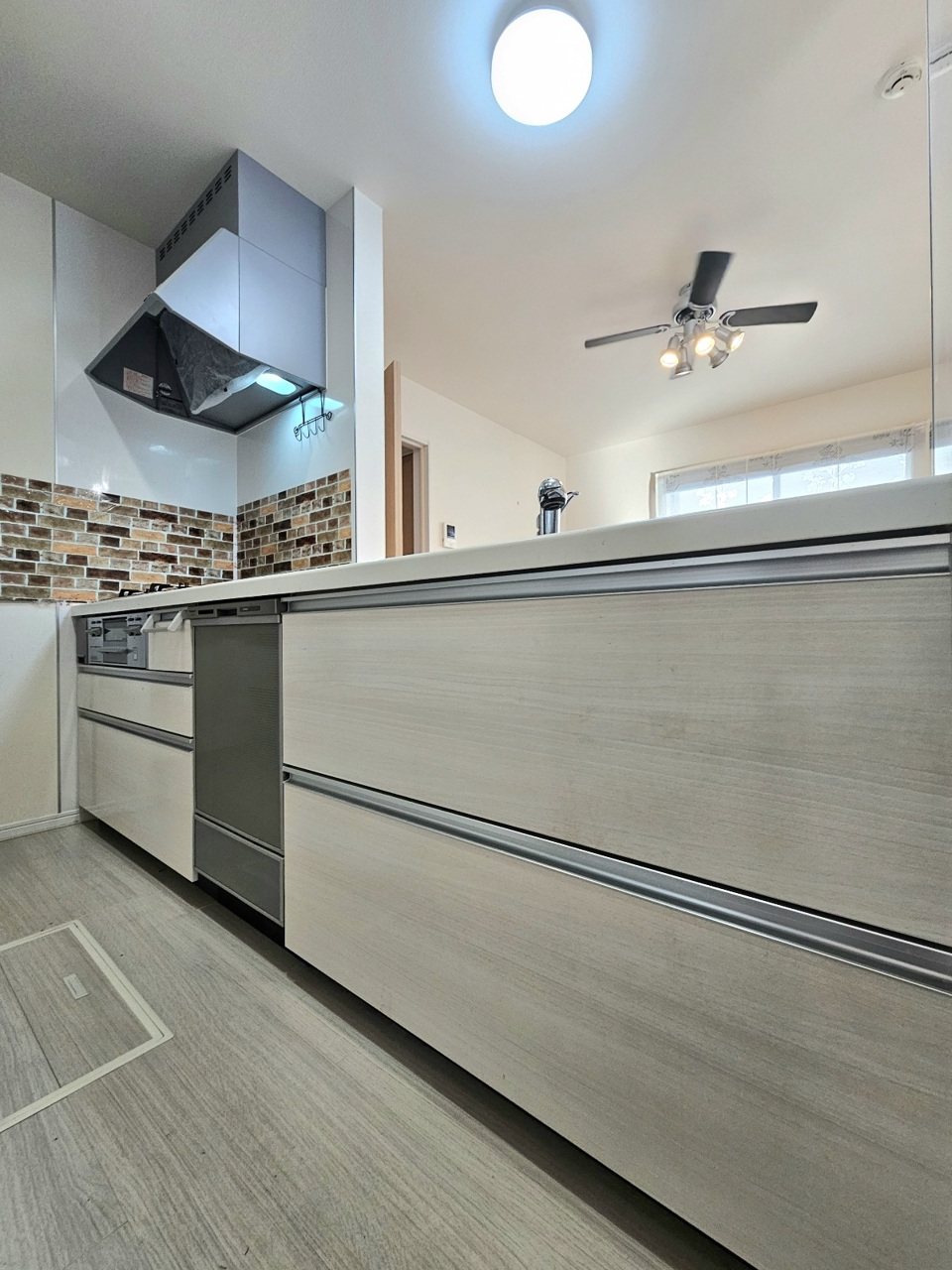 ご家族との会話が弾む対面キッチン。奥にはうれしいパントリースペースがございます。