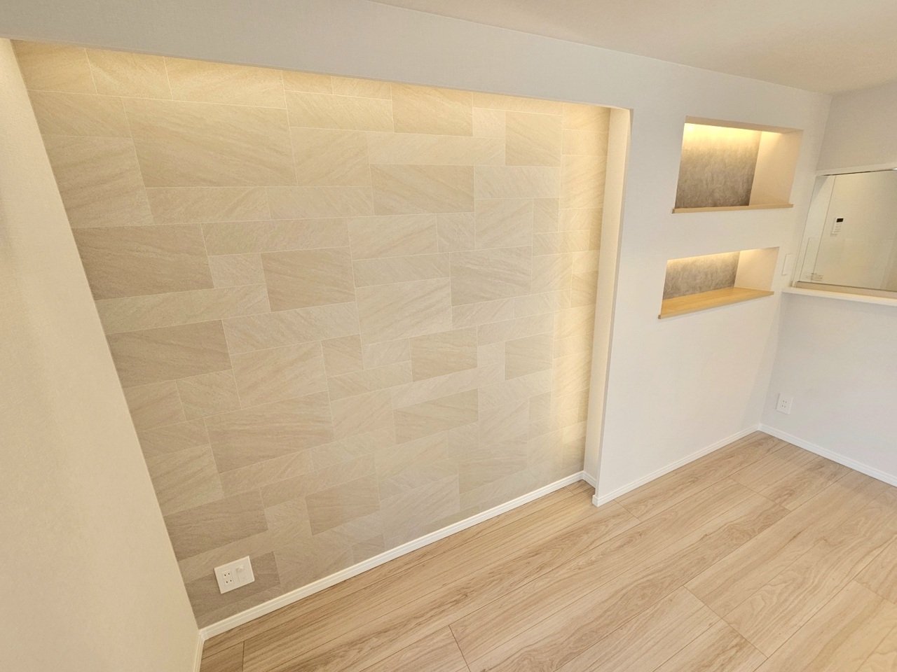 アクセントクロスと飾り棚を設けた雰囲気の良いリビングです。