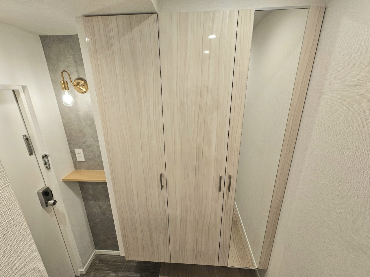 ミラー付きのトール型玄関収納でお出かけ前の身だしなみチェックもばっちりです!