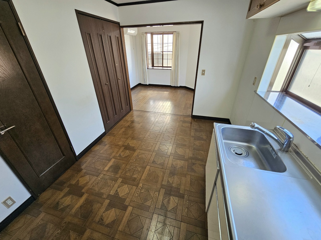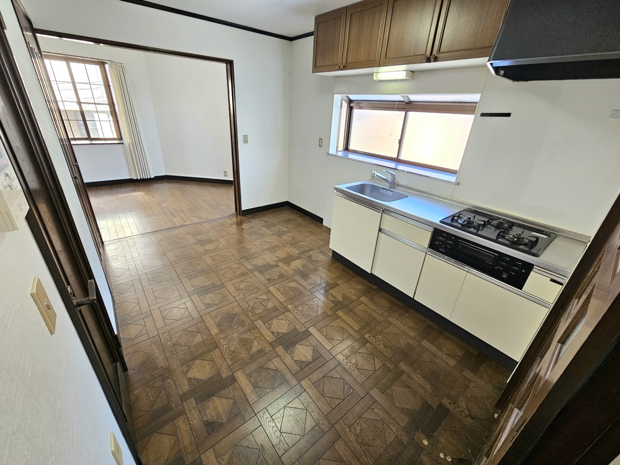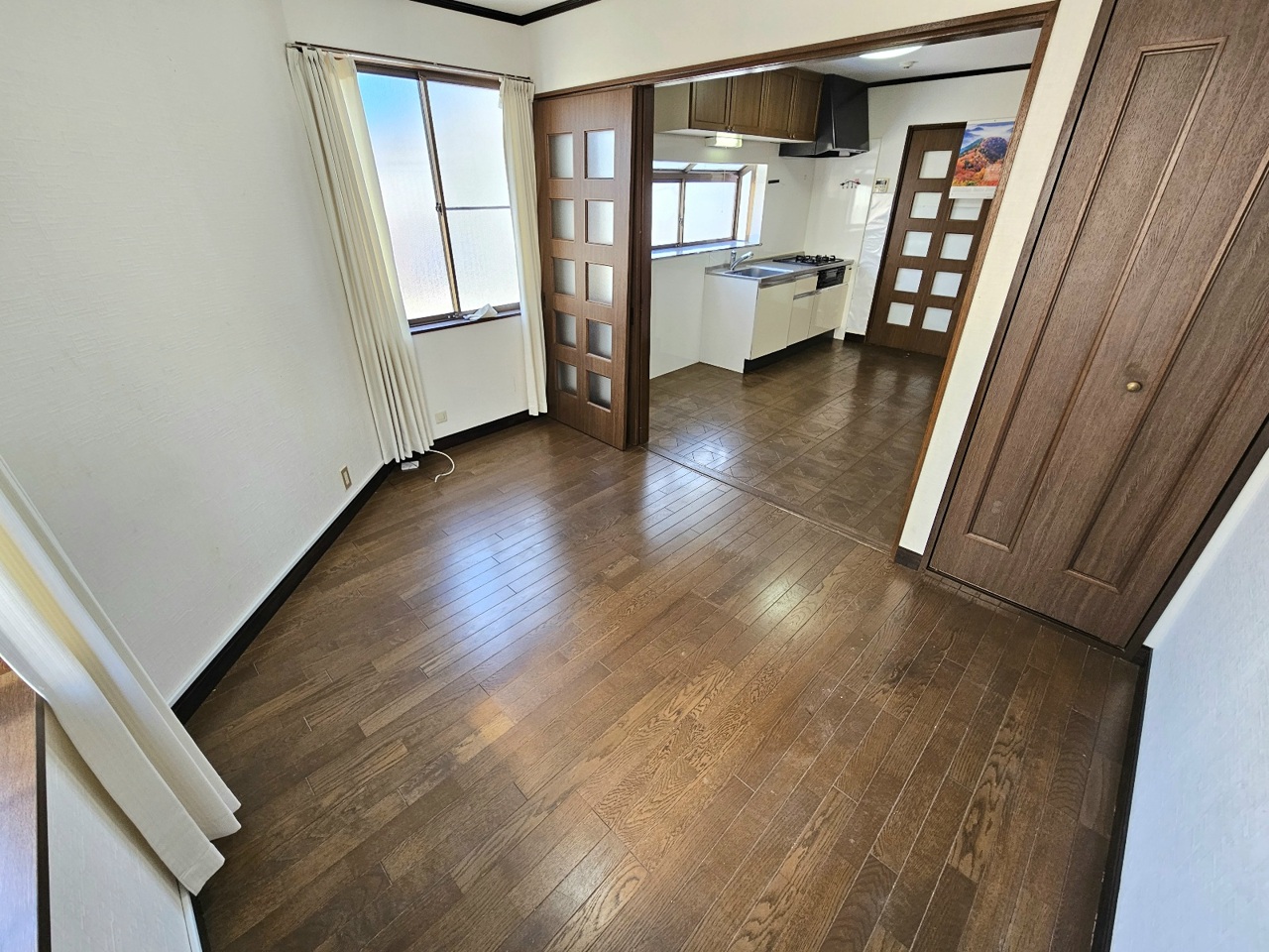 キッチンから続き間の5.4帖の洋室にかけての写真です。開放してLDKとしてお使いいただいても便利です。