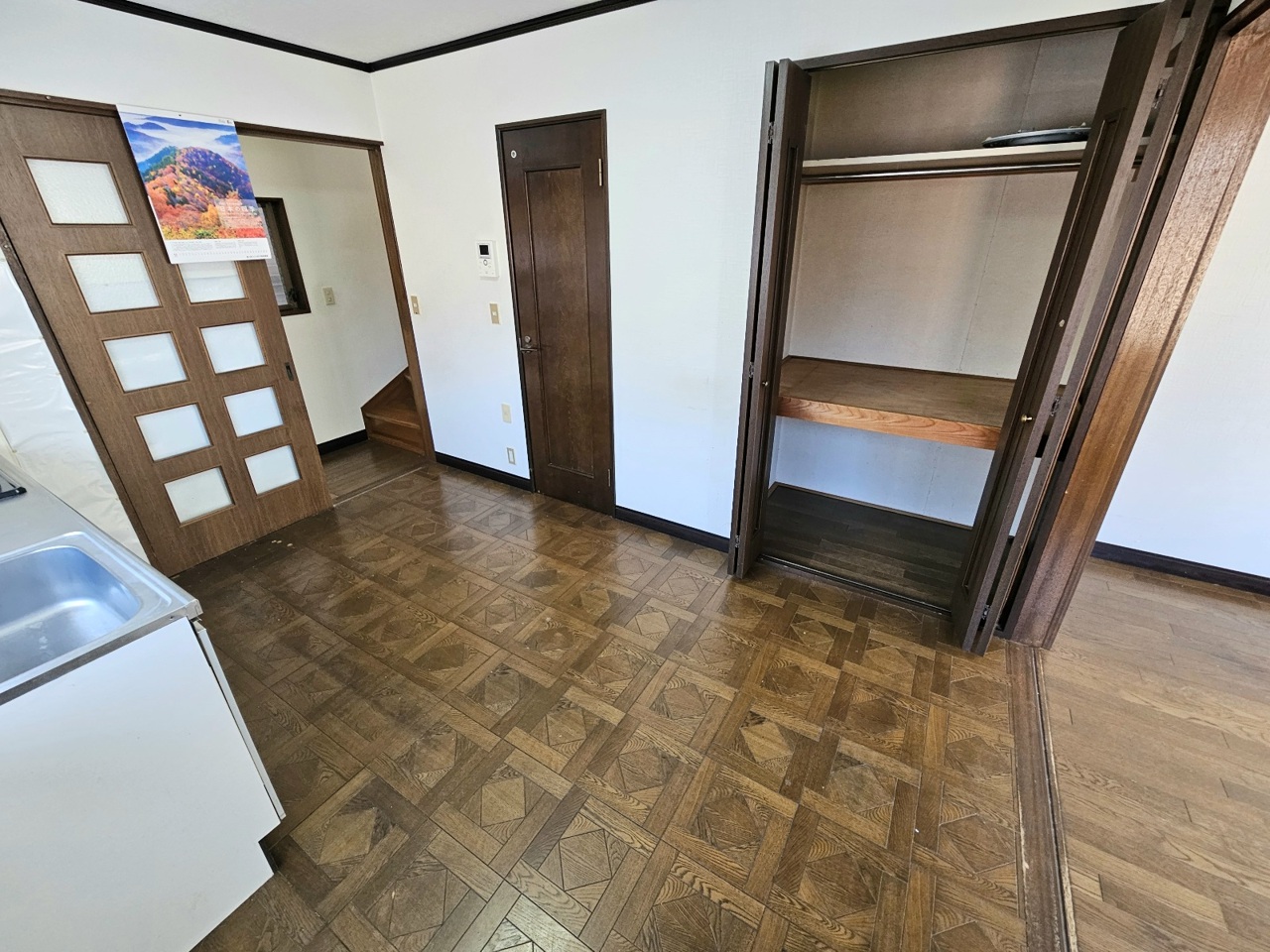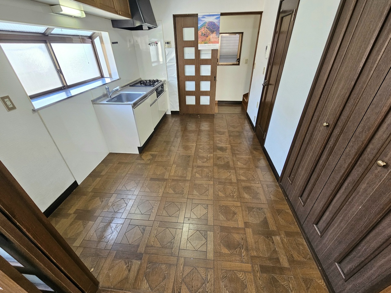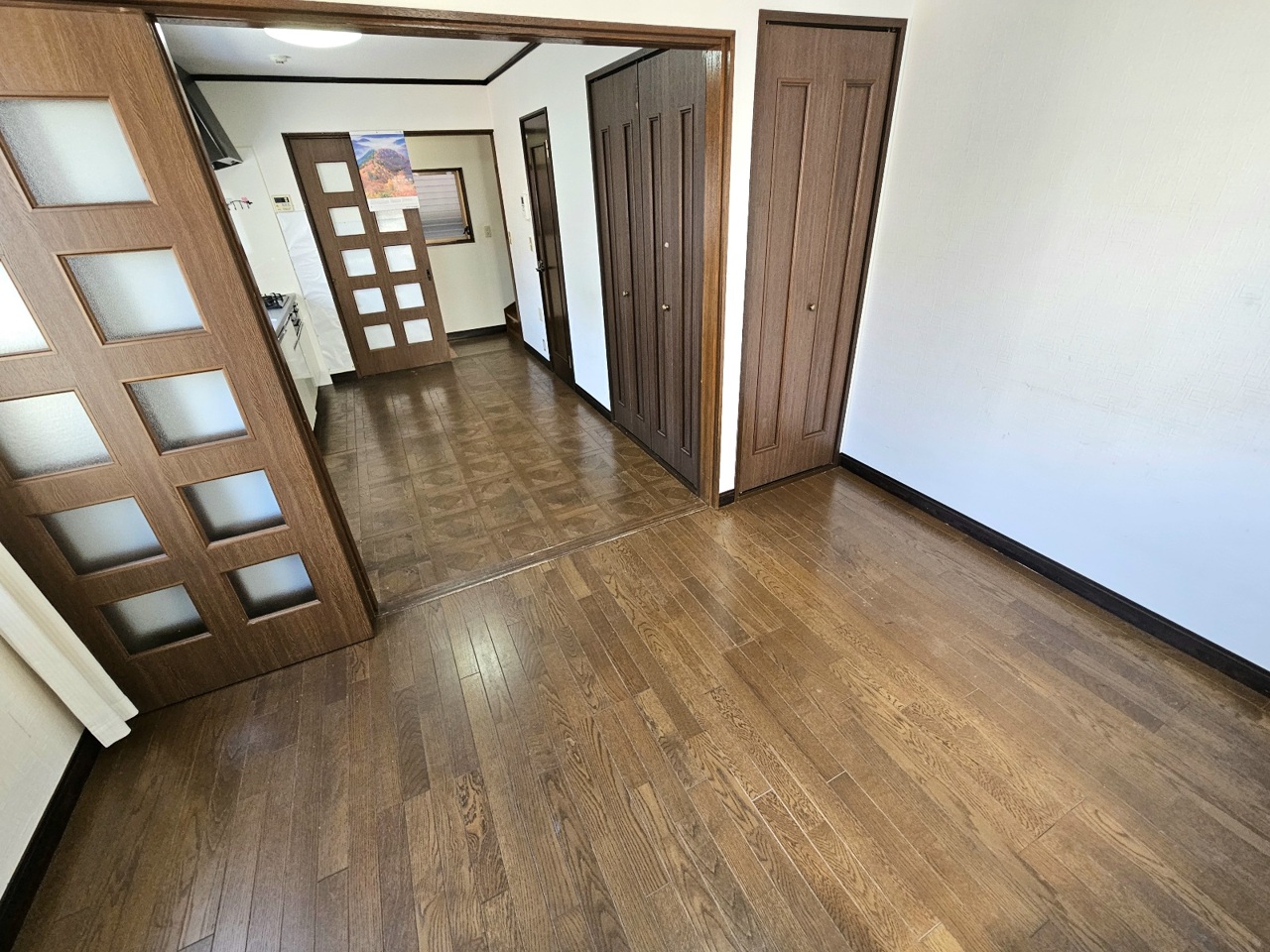キッチンから続き間の5.4帖の洋室にかけての写真です。開放してLDKとしてお使いいただいても便利です。